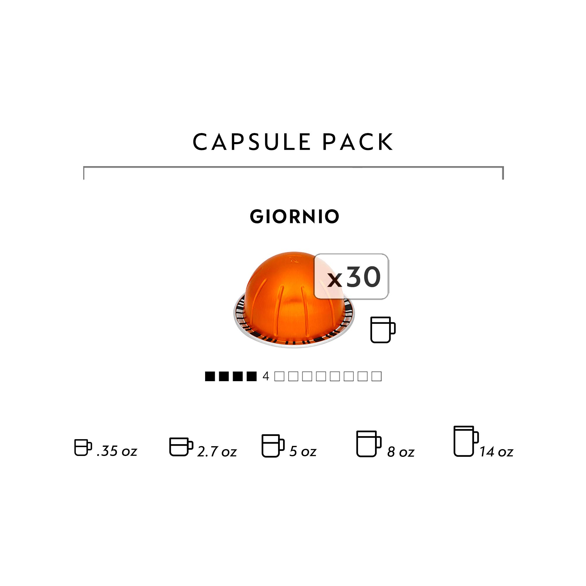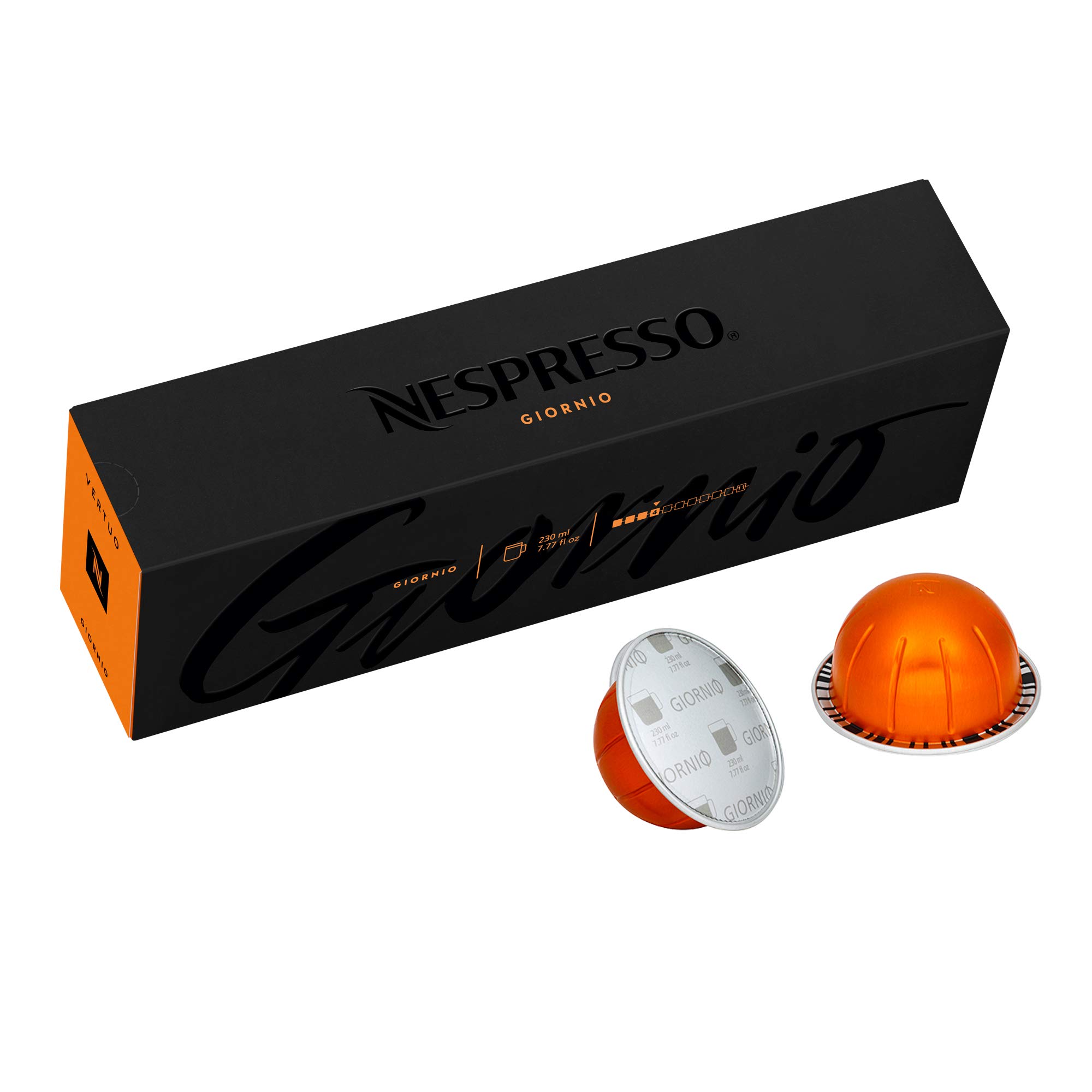 GIORNIO A medium roast breakfast blend coffee for the Nespresso VertuoLine system. Sold in sleeves of 10 capsules, each capsule brews a 7.8 oz. cup of coffee. VertuoLine machines are designed to capture the rich textures of espresso in a full size cup of coffee. VertuoLine capsules have unique barcodes which are read by the machines to ensure perfect extraction at the touch of a button. Giorgio capsules only compatible with Nespresso VertuoLine machines. Will not work with Original Line machines. FLAVOR PROFILE Giorgio first expresses toasted cereal tones, followed by subtle white floral notes characteristic of Ethiopian Arabica; this is awakened by the acidity of Kenyan Arabica. All are harmoniously combined in this medium roasted morning blend. With milk, acidity from the Kenyan Arabica brings a smooth sweetness to the coffee. QUALITY THROUGH SUSTAINABILITY Sustainable coffee production ensures our supply of high quality coffee for the future. In partnership with the Rainforest Alliance, our AAA Sustainable Quality Program protects the environment, empowers farmers and more. RECYCLABILITY Nespresso capsules are made of 100% recyclable aluminum. As the perfect protector of coffee, aluminum capsules keep over 900 distinct aromas safe from the elements.