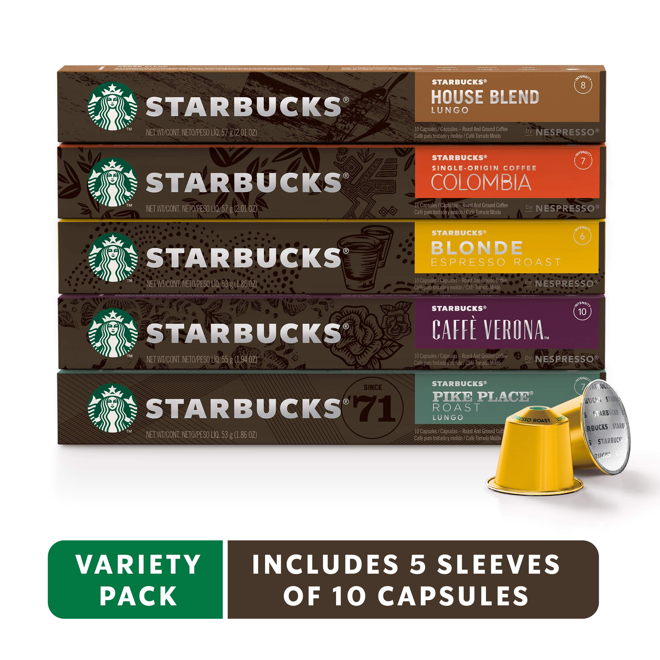 This variety pack of Best Selling Favorites of Starbucks Nespresso roasts includes Blonde Espresso Roast, House Blend, Single-Origin Colombia, Pike Place Roast, and Caffè Verona